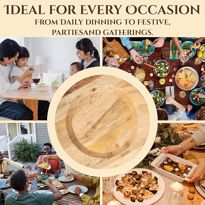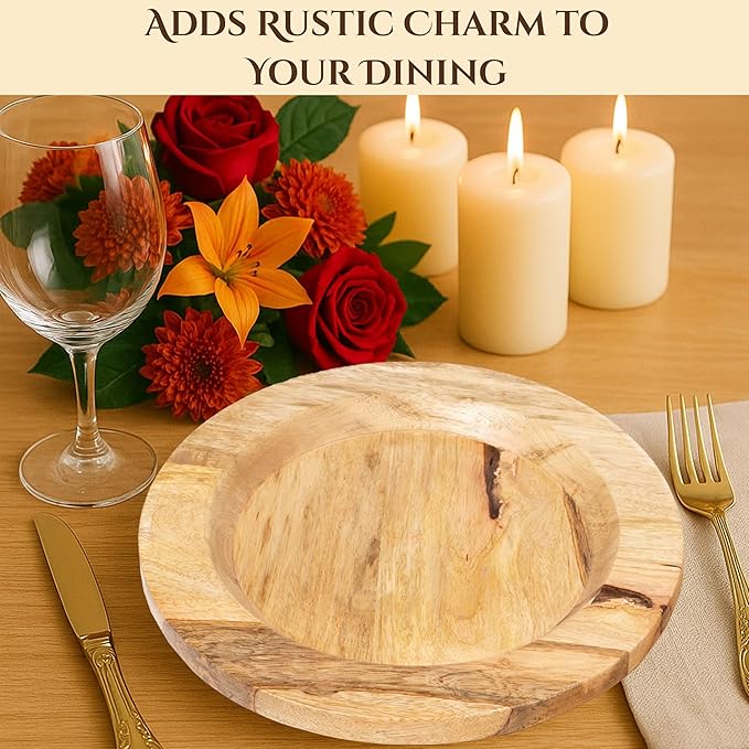 • ✅ PREMIUM NATURAL SOLID WOOD MATERIAL: Crafted from real hardwood with a smooth, durable finish that resists wear and adds rustic charm. Designed for lasting use, blending timeless elegance, durable wood charger plates, tableware perfect for farmhouse decor, rustic kitchen, or event hosting.