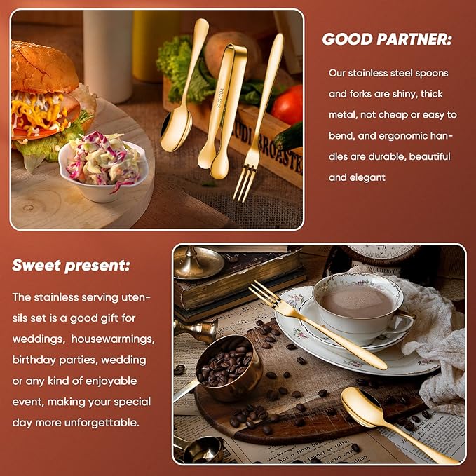 • Mini serving utensils set: this complete utensils set includes 4 pieces mini serving tongs, 10 pieces small spoons and 10 pieces small forks for serving, applied in butter, cheese, jelly and pastry making; It is enough to satisfy your daily needs and can be given to relatives and friends as a practical and elegant gift, which can bring a lot of convenience