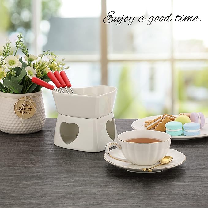 • 🍲PACKAGE INCLUDED - This chocolate fondue pot butter warmer bowl set comes with a ceramic cup,a ceramic fondue base and 4 fondue forks. Note: Tea light candle is not included.