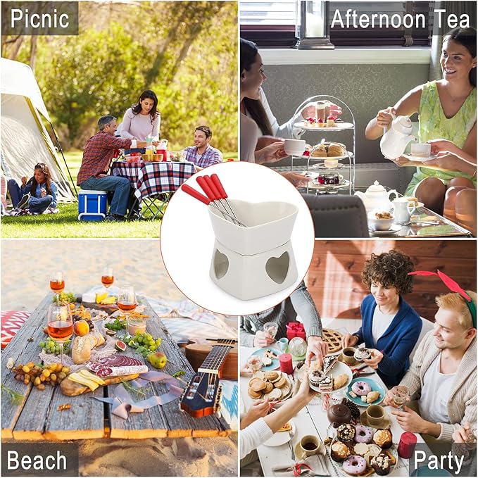 • 🍲ADAPTABLE TO MANY OCCASIONS - This fondue set is perfect for picnics, afternoon tea, beaches, gatherings, buffets and party tables. Make delicious dips and enjoy with your favorite fruits, vegetables, cookies, treats, marshmallows, mini cupcakes and more.This fondue sets is your go-to for showcasing any type of food, other desserts or appetizers.