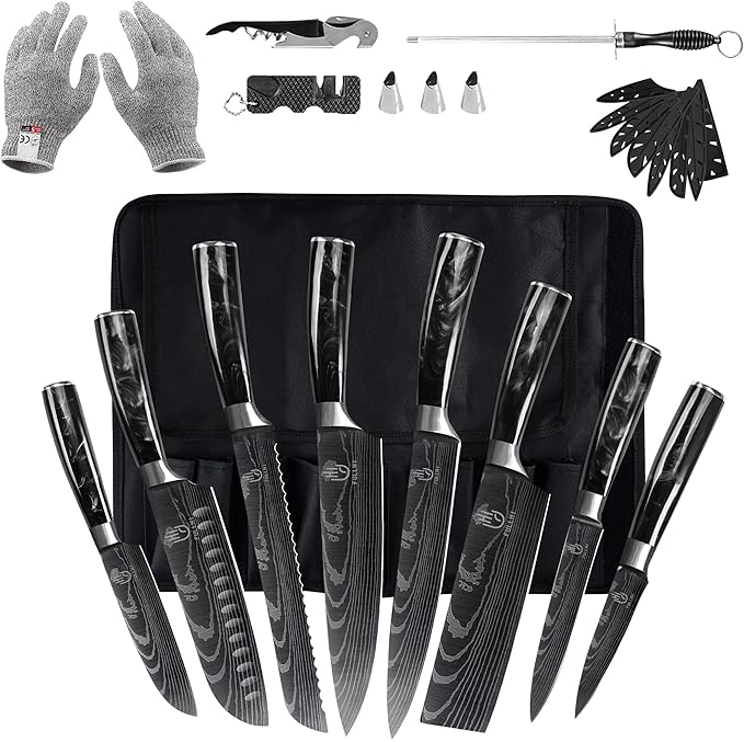 • ALL-INCLUSIVE KNIVES SET: 14-piece kitchen knife set includes 8" Chef Knife, 8" Slicer Knife, 8" Bread Knife, 7" Santoku Knife, 5" Santoku Knife, 7" Cleaver Knife, 5"universal knife, and 3.5" Paring Knife. 3 Stainless Steel Finger Guards, 1 Bottle Opener, 1 Pair of Cut Resistant Gloves, 1 Portable Knife Sharpener, 1 Sharpening Stick are included in our giveaway. Whether cooking at home or outdoors, it can meet your needs.