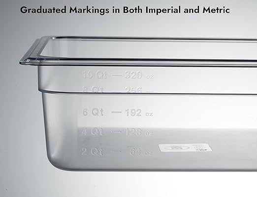 • UPGRADED MODEL - This model also boasts a scratch resistant textured bottom and edges. And the clear polycarbonate material of these food pans allows for easy visibility of the contents, making it easy to identify and retrieve the food items you need. These food pans are temperature-resistant, they can withstand extreme temperatures ranging from -40°F to 210°F, making them suitable for use in a variety of food service applications.