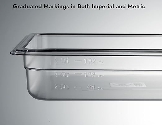 • UPGRADED MODEL - This model also boasts a scratch resistant textured bottom and edges. And the clear polycarbonate material of these food pans allows for easy visibility of the contents, making it easy to identify and retrieve the food items you need. These food pans are temperature-resistant, they can withstand extreme temperatures ranging from -40°F to 210°F, making them suitable for use in a variety of food service applications.