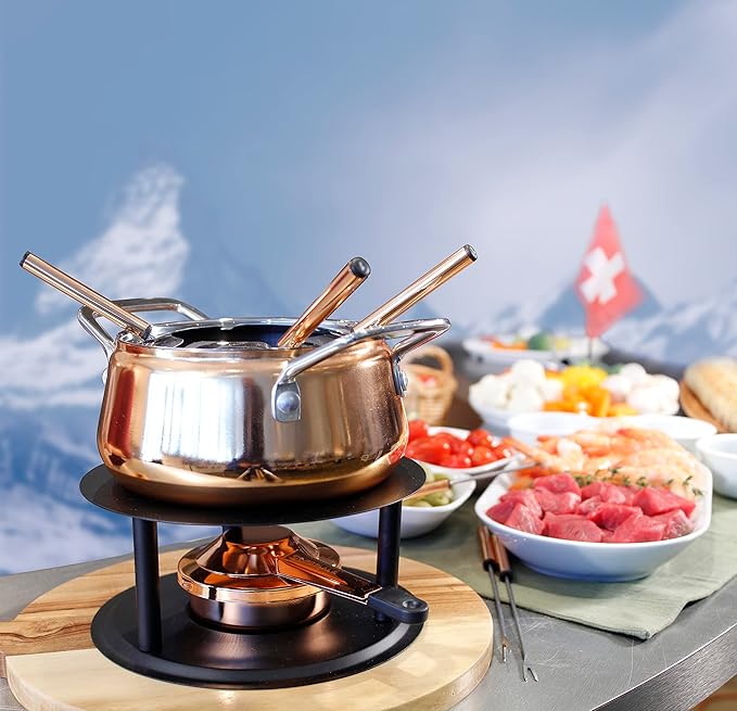 • STYLISH AND FUNCTIONAL: Combining sleek copper plating with durable stainless steel, this fondue set offers a perfect balance of modern design and functionality for your kitchen and dining needs.