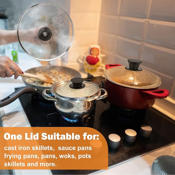 • 【Tempered Glass Pan Lid】: The pan lid with stainless steel rim fits tightly to pots and pans, making it easier to lock in moisture and seal in flavor of food. Suitable for most of cookware such as cast iron skillets, frying pans, woks, pots and more.