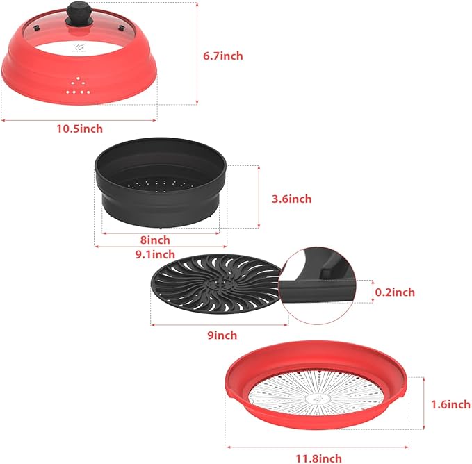 • 【Food Grade Material】: Food safe durable tempered glass and silicon, BPA and chemical free, High-temperature resistant glass, Foldable silicon microwave cover, Includes plate cover and tray to protect your microwave from splashes and spots. The tray has two handles to prevent burns and allow you to quickly remove heated food.