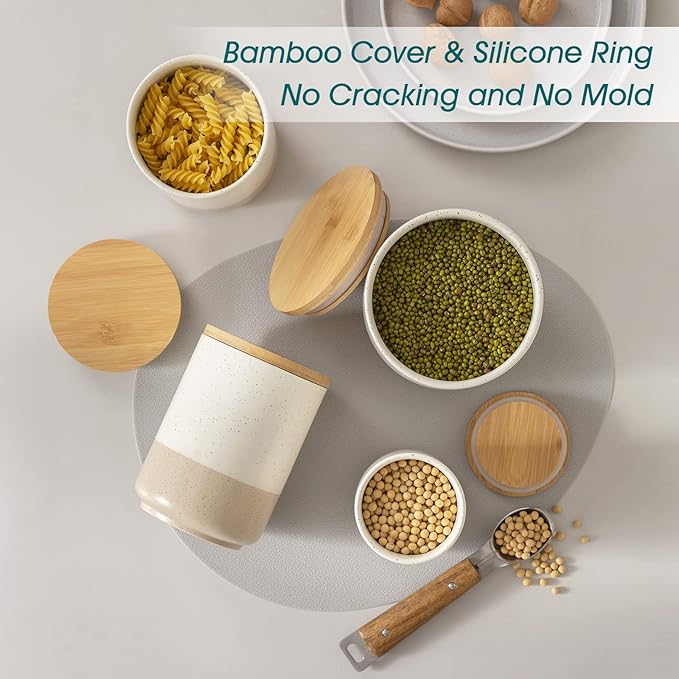 • 【High-quality Material】The canisters are made of high-quality terracotta, which is not easy to crack, and is more durable than plastic and glass. The lid is made of bamboo wood, with an environmentally friendly sealing rubber ring to improve the sealing. Effectively keep the items dry and fresh.