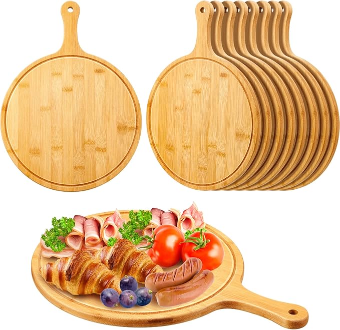 Nuenen 10 Pcs Round Wood Cutting Board with Handle Bamboo Wooden Serving Kitchen Chopping Boards for Pizza, Bread, Cheese, Charcuterie, Fruit, Vegetables(Bamboo)