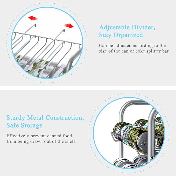 • 【Perfect Size】The can good organizer size is 16.89*12.44*35.35. Each tier comes with 2 adjustable dividers, which can help you sort and manage cans and beverages and keep the storeroom/cabinet/pantry in order.