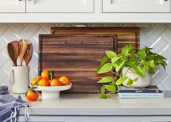 • PREP & SERVE WITH THE SAME BOARD - Sonder LA's Franklin Cutting Board with Juice Groove is designed to be your go-to for entertaining and everyday food preparation. It's reversible, with the deep juice groove on one side which prevents up to 4.5 oz liquid from running onto your countertops. The other side can be used for heavy duty slicing and dicing as well as serving as a gorgeous extra-large charcuterie board. Inset side grooves make it easy to pick up. Removable rubber feet reduce slipping.