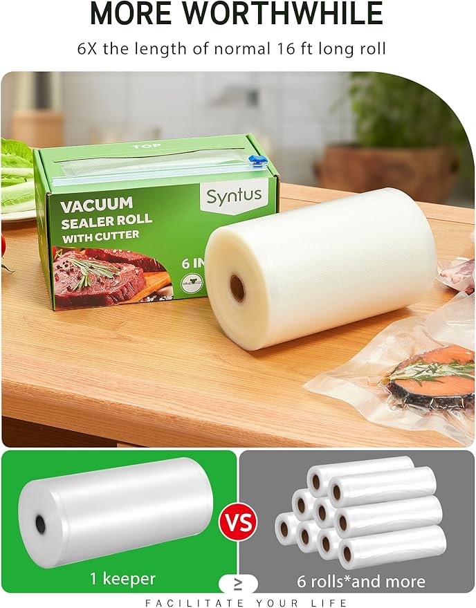 Syntus 6" x 100' Food Vacuum Seal Roll Keeper with Cutter Dispenser, Commercial Grade Vacuum Sealer Bag Rolls, BPA Free Food Vac Bags, Ideal for Storage, Meal Prep and Sous Vide