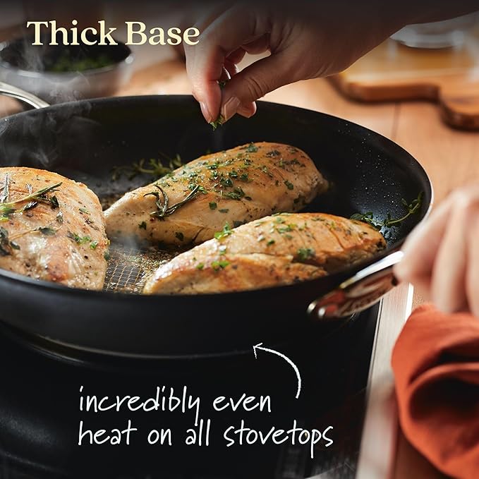• INNOVATIVE BASE: Hybrid nonstick frying pan features a thick, uniquely constructed stainless steel base that delivers incredibly even heat on any cooktop, including induction