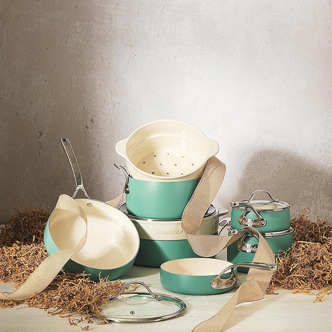 Bloomhouse 12 Piece Aluminum Pots and Pans Cookware Set w/Non-toxic Ceramic Non-stick, Ceramic Steamer Insert, & 12 Protective Care Bags - Sage Green