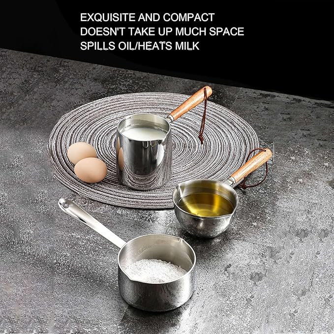 • Single pour spouts milk warmer pot: Butter warmer pot, our mini rustproof butter melting pot has pour spouts on single side, stainless steel milk and coffee warmer, allowing you to easily strain pasta, pour oil, chocolate and more with your left or right hand.Size: Approx. 8.5 x 8.5 x 9.5cm/3.3 x 3.3 x 3.7in