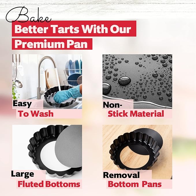 • ❖ Enjoy Secure Baking: Keep your kitchen safe with our food-grade tart pans. Our non-stick tart mold is free from PFOA, BPA, and PTFE. The edges of the pan are not sharp, and it is polished with special care to protect your fingers while handling it