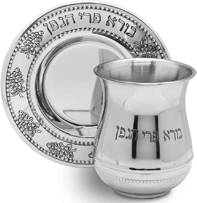 • Mess Free: This fine grape vine kiddush cup comes with a matching Stainless Steel saucer designed with a beautiful quilted design throughout, architectured with a slump in the middle of the plate for the cup to sit firmly and wine to spill into. Leaving your Shabbos or Yom Tov Table spill free.