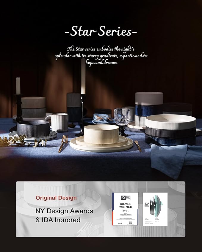 • STACKABLE: Appreciating the vertical-edge design, we've also addressed the stacking dilemma. Our dinnerware features grooves on the underside for easy, stable stacking