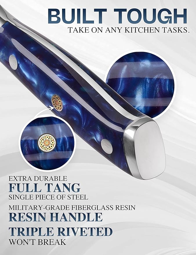 • 【Ergonomic Handle】Modern, unique handle design, full tang, and forged bolster for superb robustness, creating the perfect balance between the blade and handle. The unique shape is ergonomic for optimum comfort, control, and agility. To make it easier for the user to cut bread slices.
