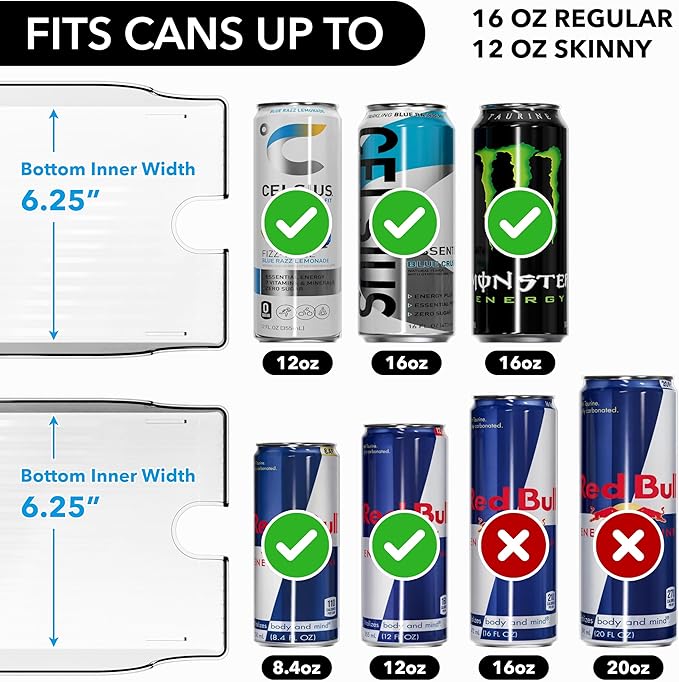 • Fits 12 OZ SKINNY CAN and 16 OZ REGULAR CAN: Holds 2 layers of canned drinks, cans can be stacked up to 3 - 5 layers with larger clearance space for efficient storage
