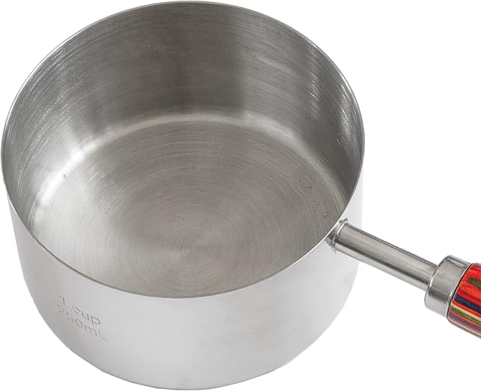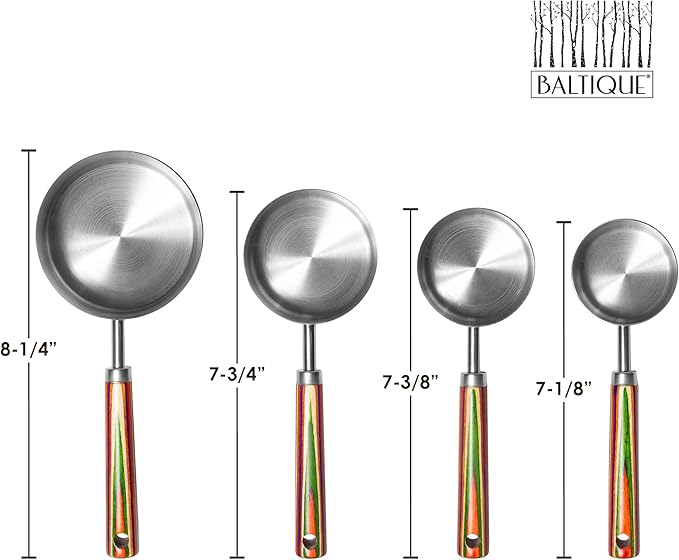• BEAUTIFUL & FUNCTIONAL: Versatile and high-quality measuring cups used for scooping, measuring and non-mess pouring; vibrant multi-colored wooden handles for extra flair in the kitchen