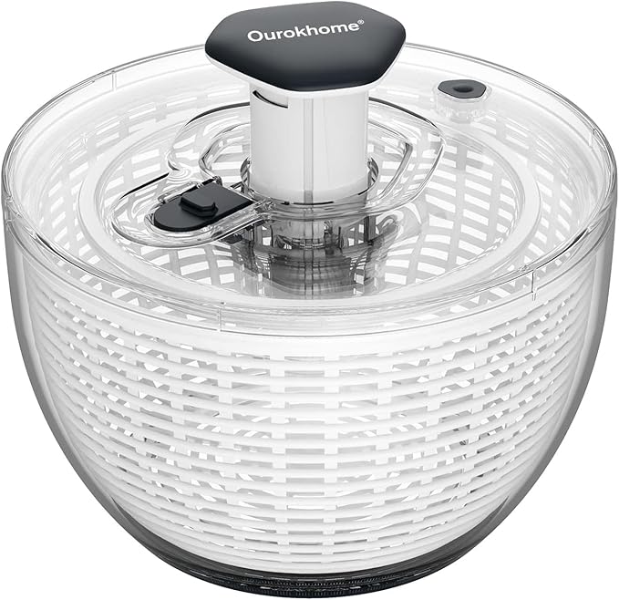 • Quick push and one handed operation salad spinner: Press the handle, the inner basket will rotate smoothly and stable at high speed, so it will separate and remove water from greens in seconds. It works equally well for left and right-handed users