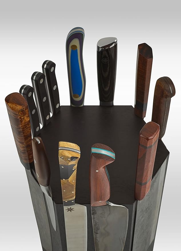 • From the inventors and makers of the ATK reccomended best universal knife block - Henry and Sara invented and make a third style rotating knife display - SMALLER than the original 360 Knife Block.