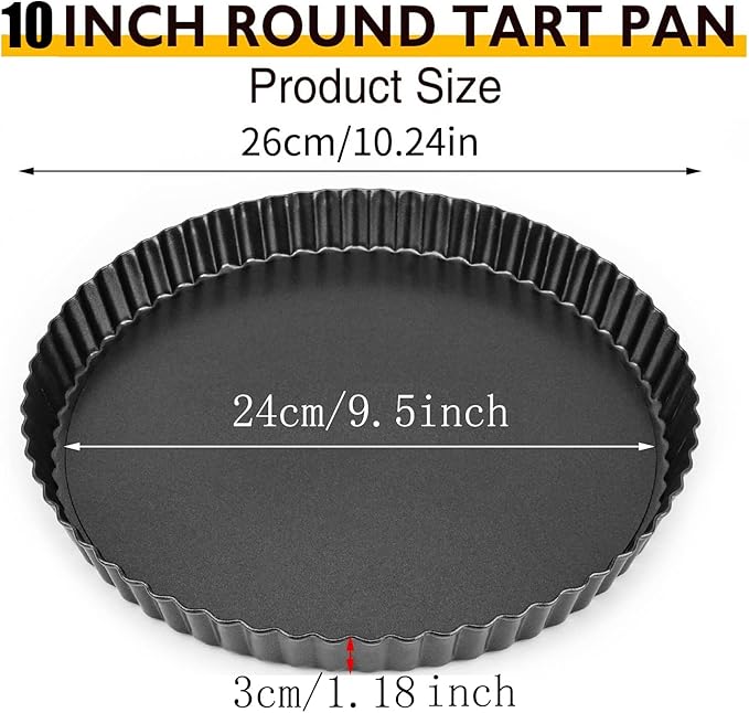 • 【DURABLE & RELIABLE DESIGN】: The 10-inch tart pan has a special nonstick coating that helps reduce the adhesion of food oils. Make your food look perfect. This 10-inch tart pan has a non-stick coating layer that prevents food from sticking to it, making your food look perfect. The fluted edges of the tart pan increase the surface area, and the base is detachable for easy release and cleaning.