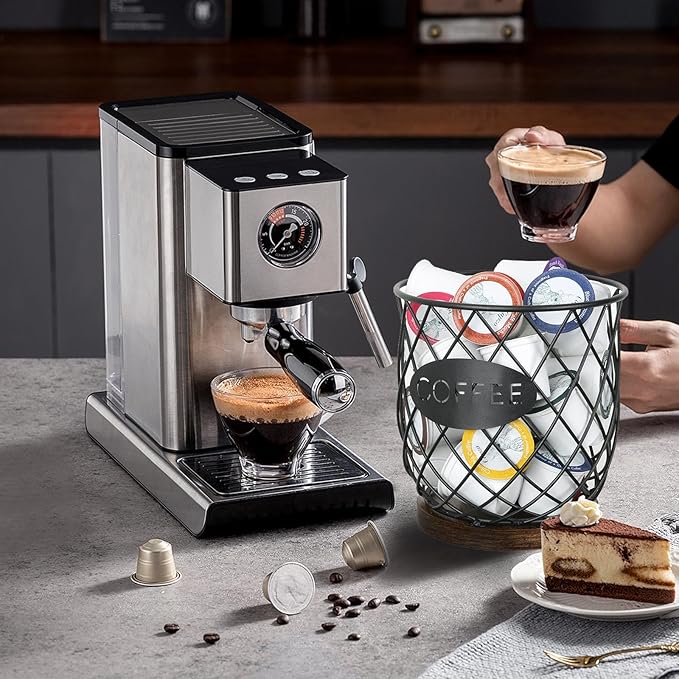 • Charming Design Style: This coffee pod holder boasts a charming design with frosted surface iron wire and brown wood panels. It adds a vintage texture to your coffee bar and is perfect for those who enjoy organizing and decorating their space. The basket is easy to clean, but we suggest handwashing it only.
