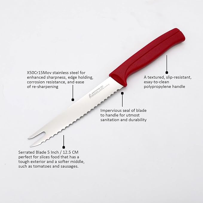 Tomato Knife - MATTSTONE HILL 5 Inch Serrated Kitchen Utility Knife, Serrated Cheese Tools, German X50CrMoV Steel, Red Handle