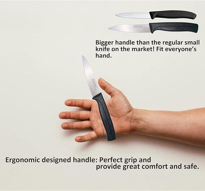 • Ergonomic designed handle: Perfect grip and provide great comfort and safe. This petty decent kitchen knife is a essential tool for every kitchen.