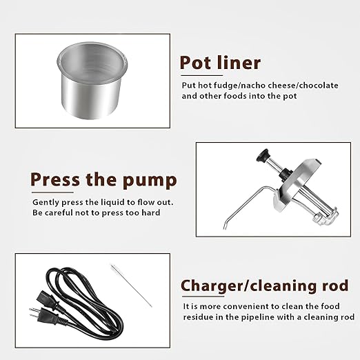 • The cheese pump dispenser uses a 2.6 Qt stainless steel canister to hold a large amount of cheese or fudge, and the thick body also keeps hot fudge warmer and is durable and resistant to warping with use.