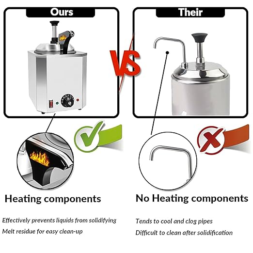 • This cheese machine dispenser can be used to melt nacho cheese, hot fudge, chocolate, caramel, chili peppers, curry, and sauces, and is made of high-quality, food-grade stainless steel!