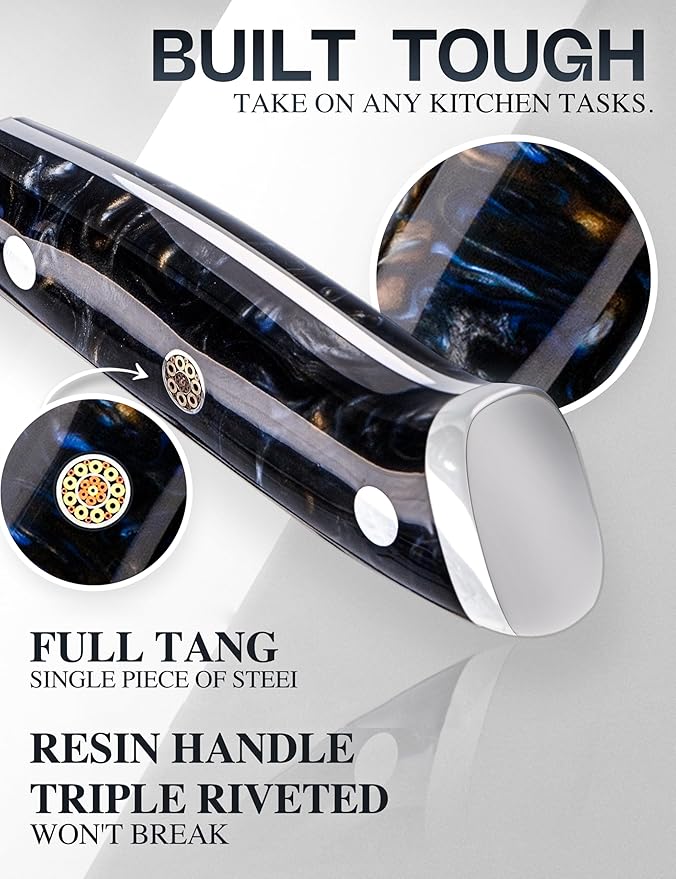 • 【Full Tang Resin Handle】Made of all resin handle which stronger and more stable than G10 handle! This is what Differentiates WILDMOK Knives from the Competition. Resin Handle Triple Riveted to the Forged Full Tang for Extra Strength, Tastefully Adorned with the Classic 3-Metal Mosaic Rivet - feels sturdy and turns heads with its rugged and gorgeous design.