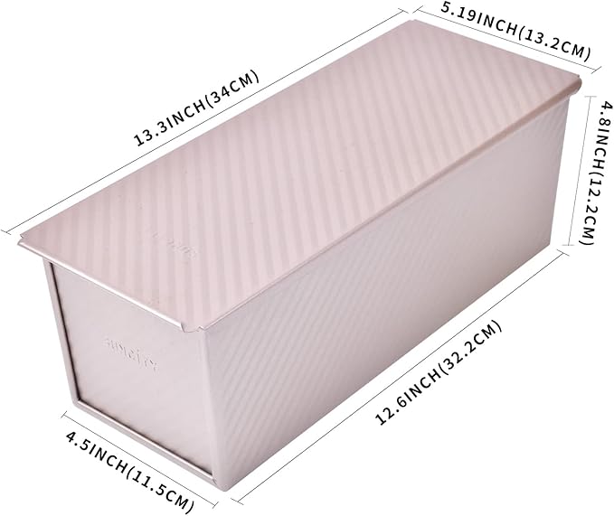 • DIMENSIONS - 13.3 x 5.2 x 4.8 inch. SUNCITY Pullman Loaf Pan is ideal for quick breads, yeast breads, pound cakes or even meat loafs. It's also the best gift for baking friends.