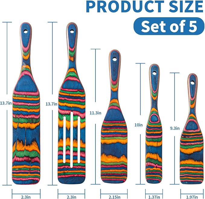 • 5 sizes for Choice: Gudamaye 5 Pcs pakkawood kitchen utensils include different sizes: Slotted Spurtle,Spurtle,Medium Spurtle,Mini Spurtle,Slim Spurtle.