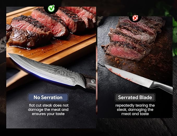 • SYOKAMI steak knives are forged to HRC56+ from high quality and safe material Japanese high carbon stainless steel, hand-sharpened to a 15-degree blade angle on each side, offering excellent and durable sharpness. Non-serrated straight-edge blade allows a smooth slice on steaks and will not tear the meat fibers to lock the original flavor and nutrition of the steak