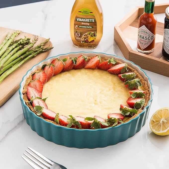 • 【MULTIFUNCTIONAL USE】 The Pie Pan is perfect for making a fruit tart, creamy cheesecake, quiche, casserole, baked macaroni, meats pie and other baked recipes. In addition, baking, serving, storing, and reheating all in one dish.