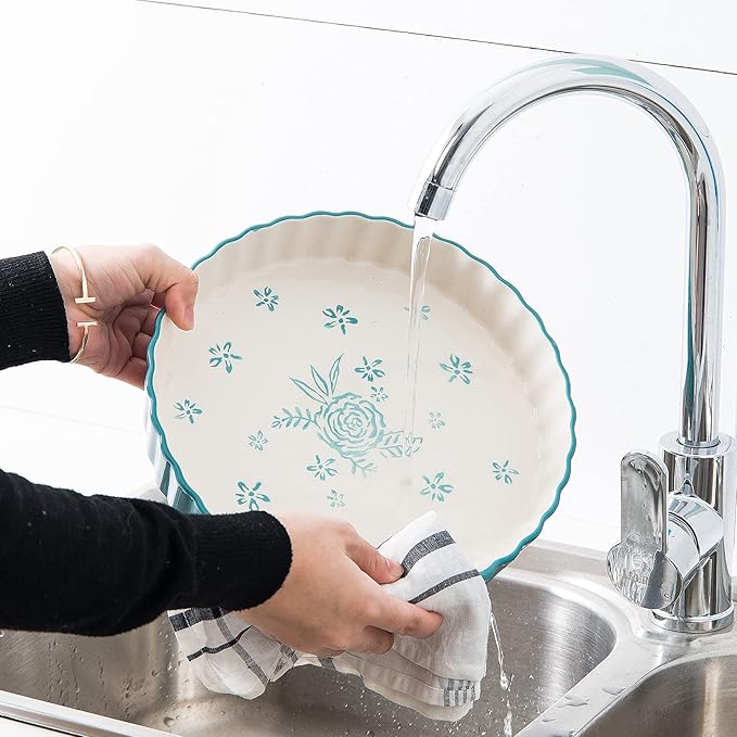 • 【CONVENIENT CLEANING】 Whether you want to clean the Pie Pan by hand or with your dishwasher, it won't matter because the smooth porcelain texture makes cleanup a breeze. and It is suitable for microwave, freezer and oven( 400 ℉ /204 ℃).