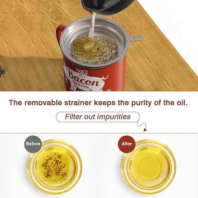 • [Health & Hygiene] - The lid fits snugly over the container to prevent dust from entering and odors from spreading, keeping the grease longer-lasting. The removable fine mesh strainer filters grease and separates food from fat, leaving clean bacon grease and reducing fat intake.