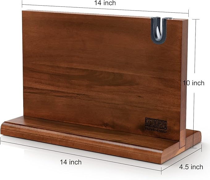 • 【Unique Design】This acacia wood knife block has a 4.5 inches base and equipped with a non-slip pad for adding strength and stability. Safe design means no more worries about knives slipping, sliding or wobbling. Packed in a beautiful gift box, this magnetic knife holder is the best gift choice for your family and friends.