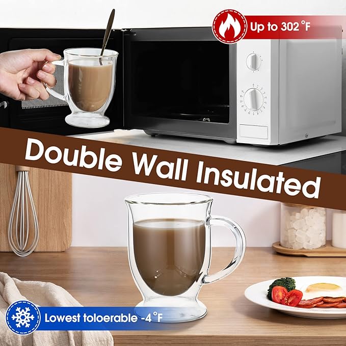 • Good Appearance: our double glass coffee mugs have elegant shape with handles, easy for you to hold, and the double wall design can keep your hand from a cold or hot drink, a crystal clear look and versatile perfect for tea, coffee, latte, espresso, cappuccino, smoothies, and juices; The glass is so clear that the coffee seems to float in the air, making it a suitable addition to your breakfast and afternoon teatime