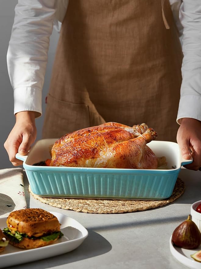 • Durable and Safe: Made from lead-free and pro-grade ceramic, this 4.2 quarts extra-large casserole dish is designed for safe use and durability. It can withstand high temperatures without cracking or breaking, and it is safe to use in dishwashers, refrigerators, microwaves, and ovens up to 500°F/260°C.