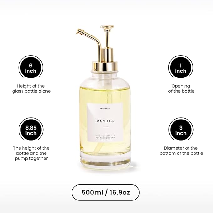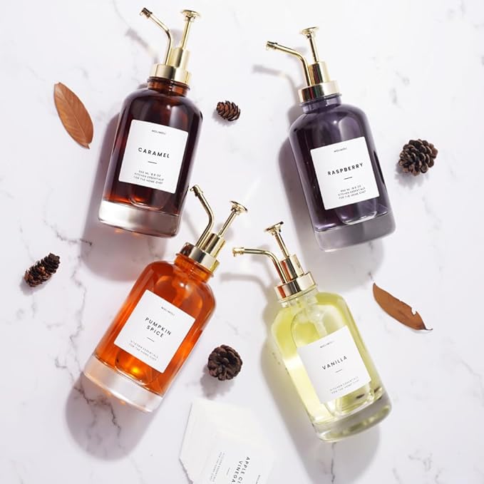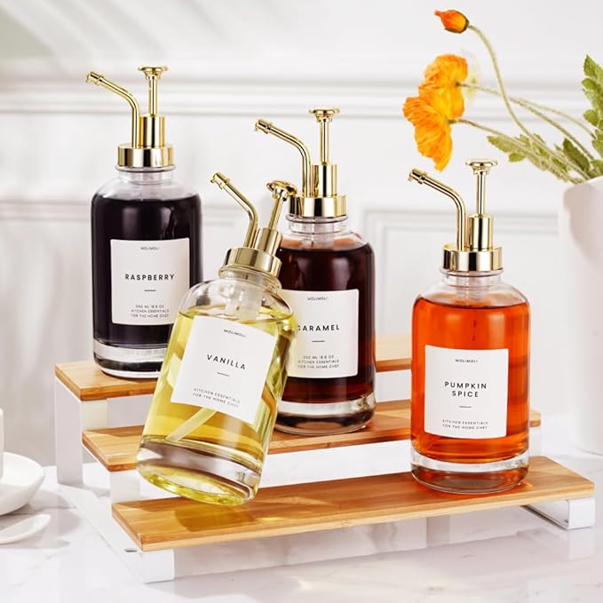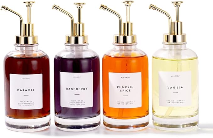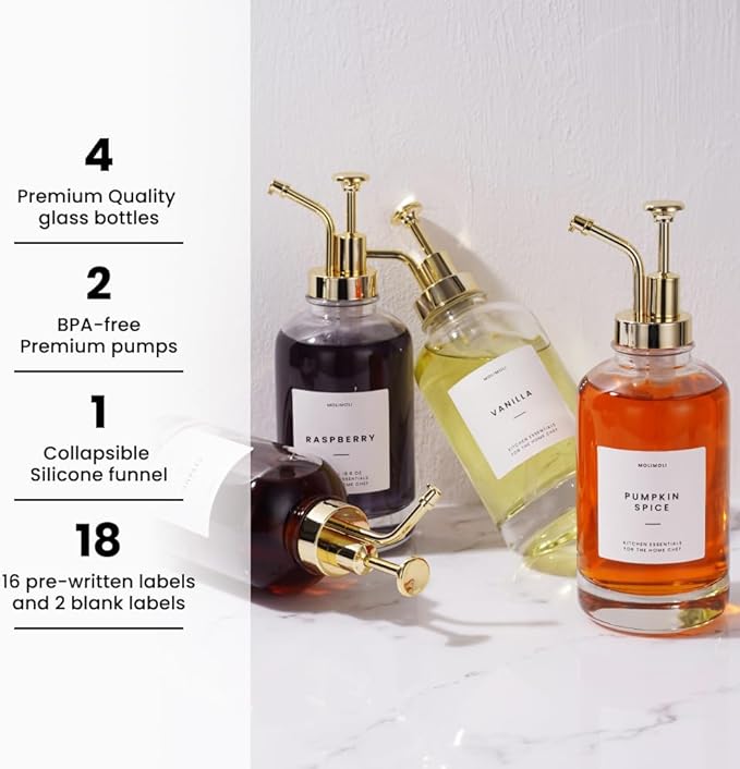 Molimoli Coffee Syrup Dispenser for Coffee Bar, Coffee Pump Dispenser, Glass Syrup Bottle w. Pump, Maple/Coffee Syrup Bottles, Set of 4 w. Labels, Gold
