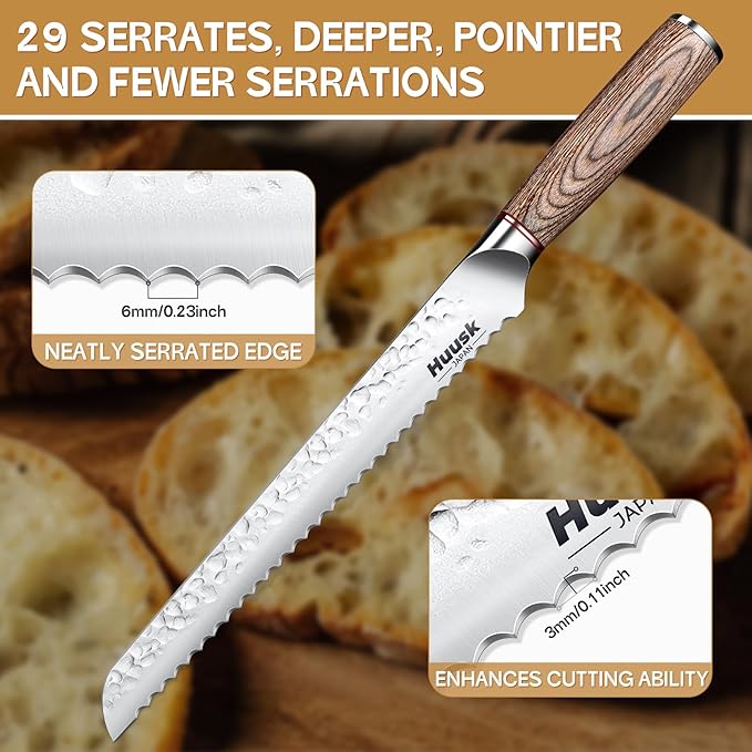 - 🍞🍞Sharpness and Good Edge Retention🍞🍞: 10.26-Inch High-Carbon Raw Materials Blade Professional Grade Bread Slicing Knife, Long Enough to make the Sawing Motion Easy. Huusk Japan Knife forged By a Traditional Hot-forging Process Combined with the Latest Heat Treatment Technology, Sharp and High Hardness, Good Edge Retention Don’t Dull Easily. He Handcraft Hammer Pattern Evenly Distributed On the Blade Increases with a Unique Aesthetic Sense.