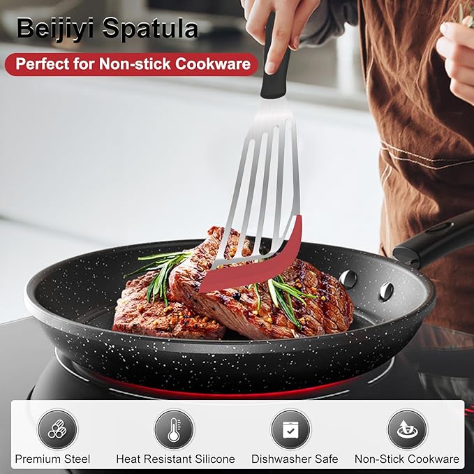 Beijiyi Fish Spatula Turner Set of 2, Heat Resistant Silicone Edge Slotted Fish Spatulas for Nonstick Cookware, Flexible and Thin Stainless Steel Kitchen Cooking Spatula Flipper for Fish, Egg, Pancake