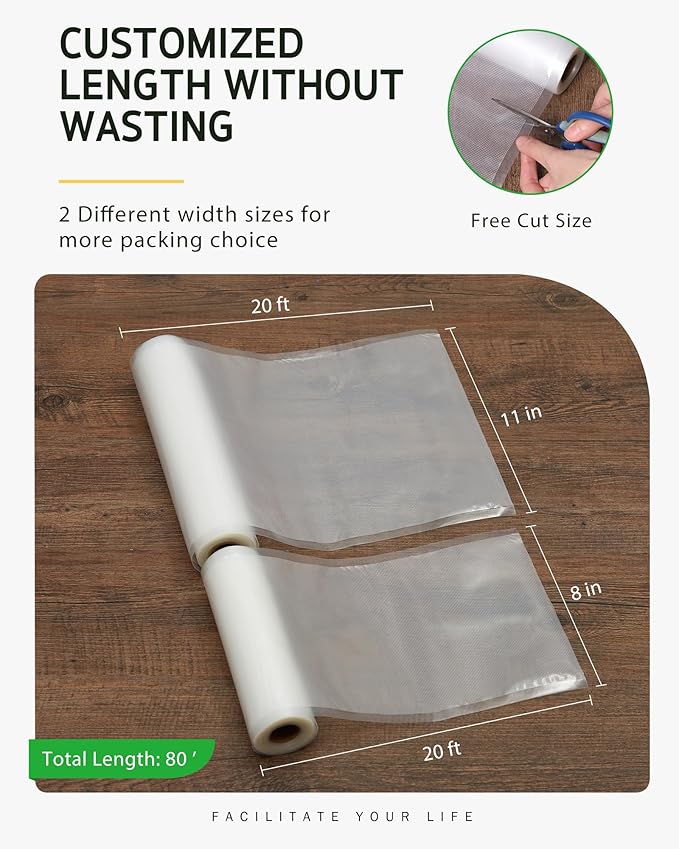- Customizable Length for No Waste: Our package includes 2 rolls of 8" x 20' and 2 rolls of 11" x 20' (totaling 80'), providing you with versatile options to accommodate different food sizes. The roll packing design allows you to cut the bags to any length you need, minimizing waste and ensuring that you can package everything from small portions to large items without any unnecessary excess material. This flexibility makes our vacuum sealer bag rolls an economical choice for all your food storage needs.