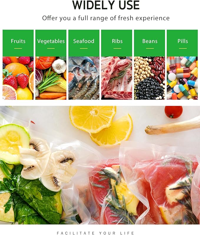 - Versatile Applications for Food Storage: Preserve the nutrition and extend the shelf life of a wide variety of foods with our vacuum sealer bags. Perfect for storing vegetables, seafood, ribs and beans, these bags help you manage your food storage efficiently. By reducing food waste and keeping your ingredients fresh, you can enjoy the convenience of having fresh food available whenever you need it. Whether you're prepping meals in advance, storing leftovers, or buying in bulk, our vacuum sealer bags are an essential tool for any household.