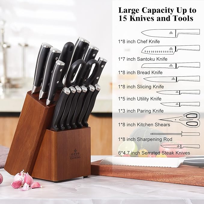 ENOKING 15 Slots Universal Knife Block, Acacia Wood Knife Block without Knives, Knife Holder for Kitchen Counter- Wider Angled Openings for Keeping Knives Sharp