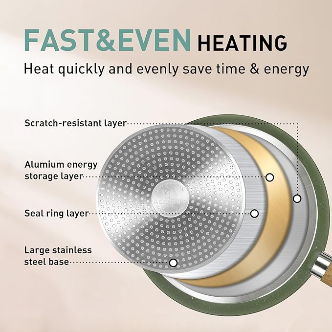• Heats Quickly and Evenly: This cookware uses professional grade aluminum core that conducts heat quickly and evenly with precise temperature control, which will save time and energy