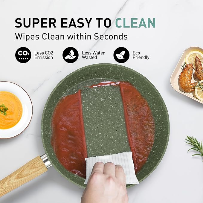 • Non-Stick Granite Coating: Our pan set interior & exterior is coated by high performance non-stick granite coating, which makes the skillet easy to cook and clean. It means less oil or butter using for healthy and better diet cooking